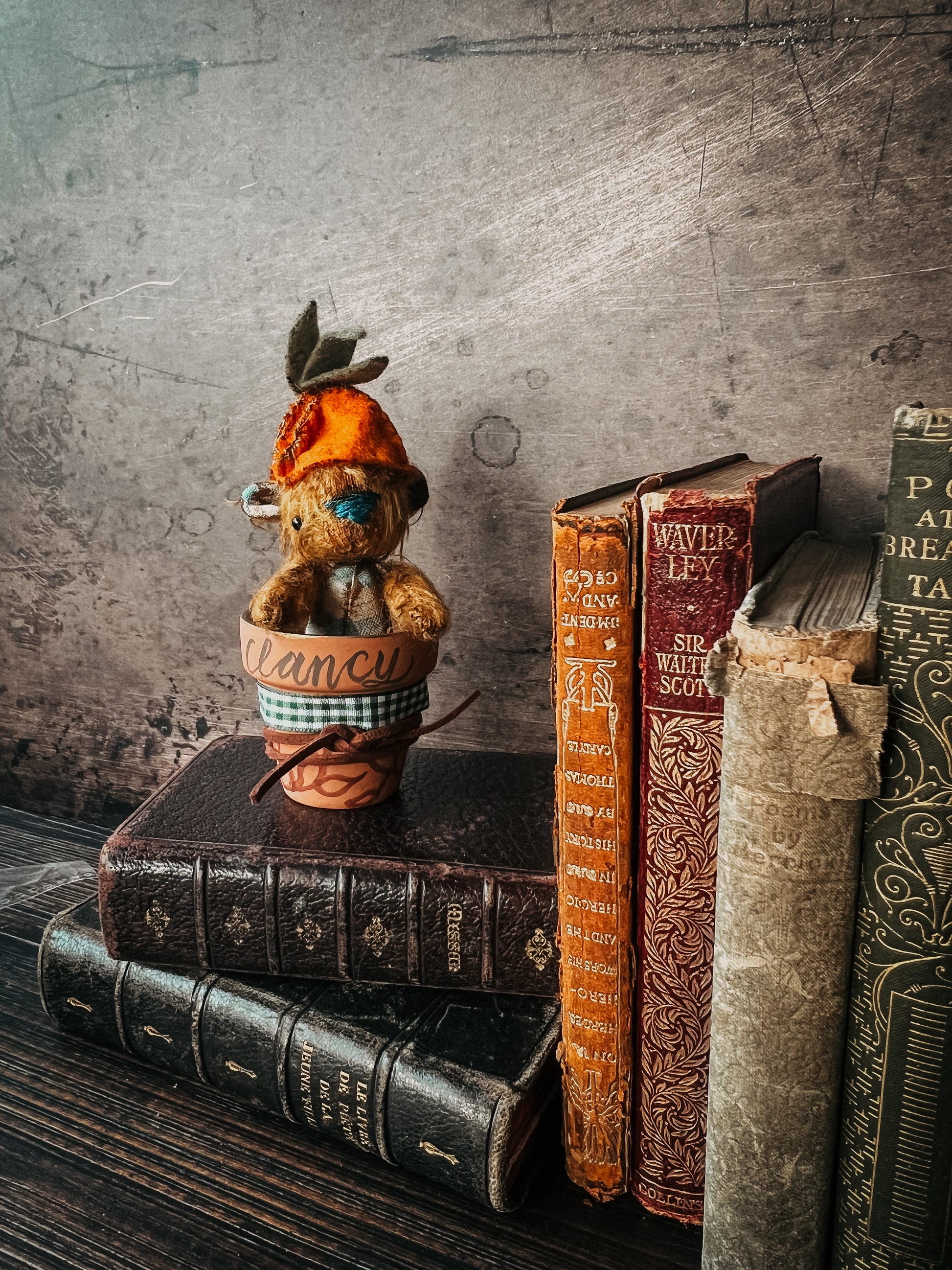 Clancy Carrot is a mini artist teddy bear and is a part of collection called Pot Plant Pals.