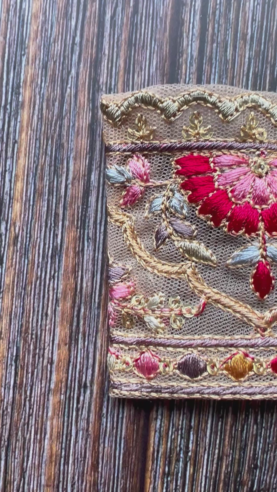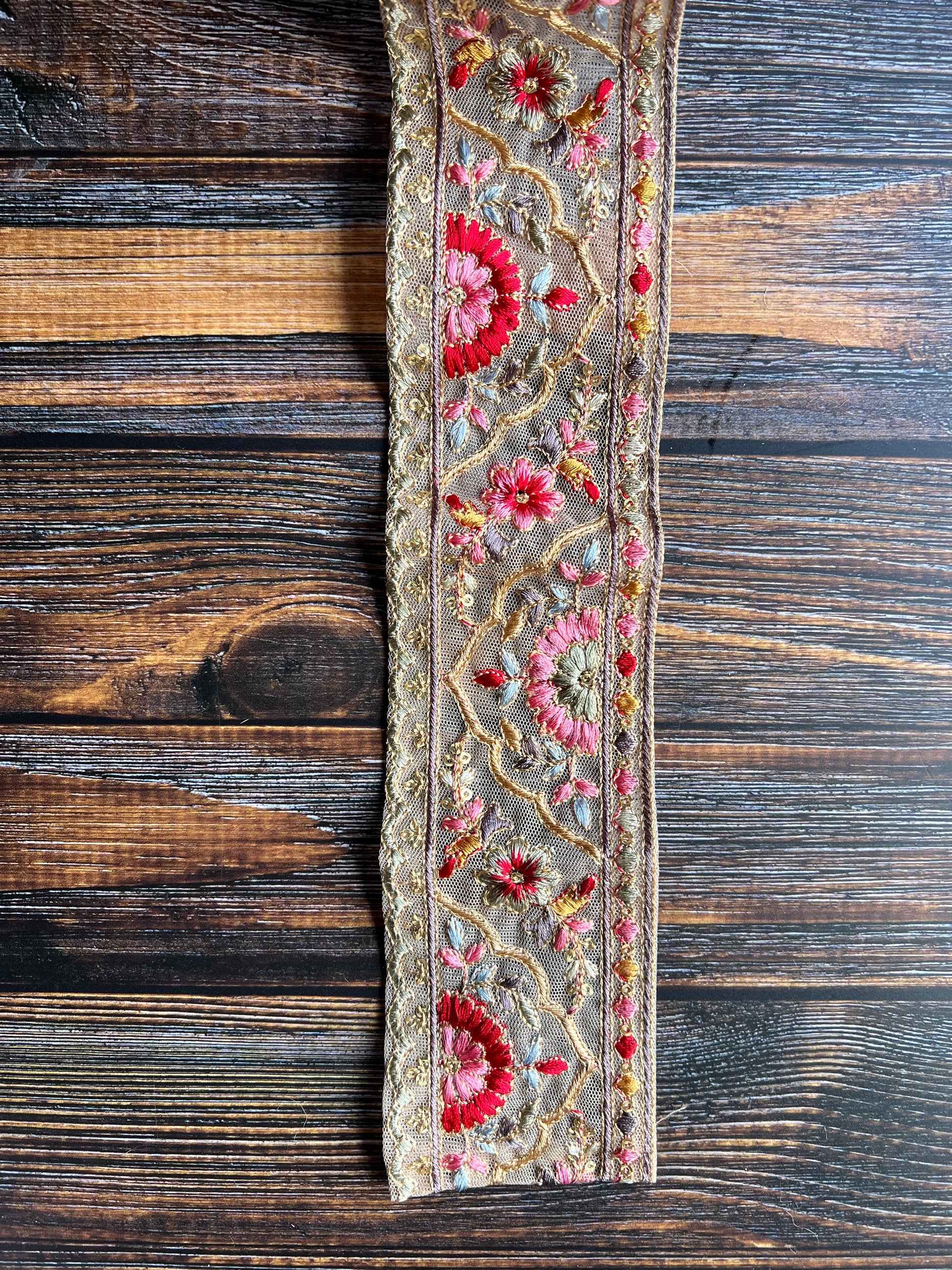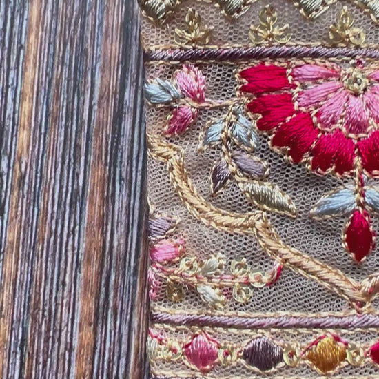 Rainbow India embroidered trim, around 2inches wide, is a beautiful accent piece featuring multicoloured floral and patterned embroidery and gold sequins on a soft gold lace base. Such a beautiful trim, reminding me of all the colours in India. Perfect for enhancing bullet journal covers, clothing accents, bag trims, or unique handmade artist bears, this trim adds a handcrafted touch to any creative project. Sold by the metre for versatile use. If you purchase multiple metres, it will be cut only once.