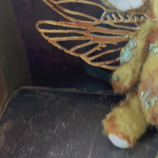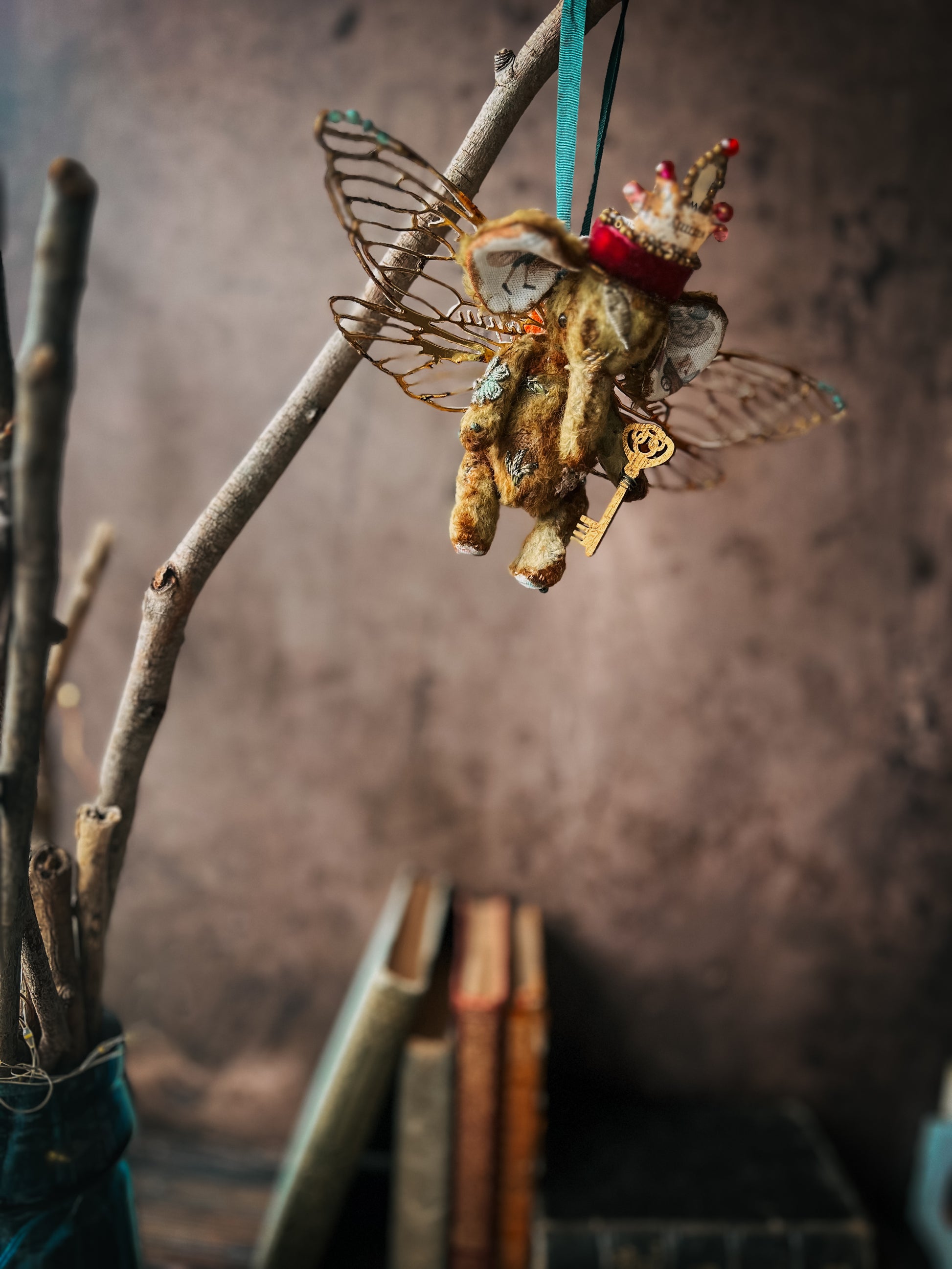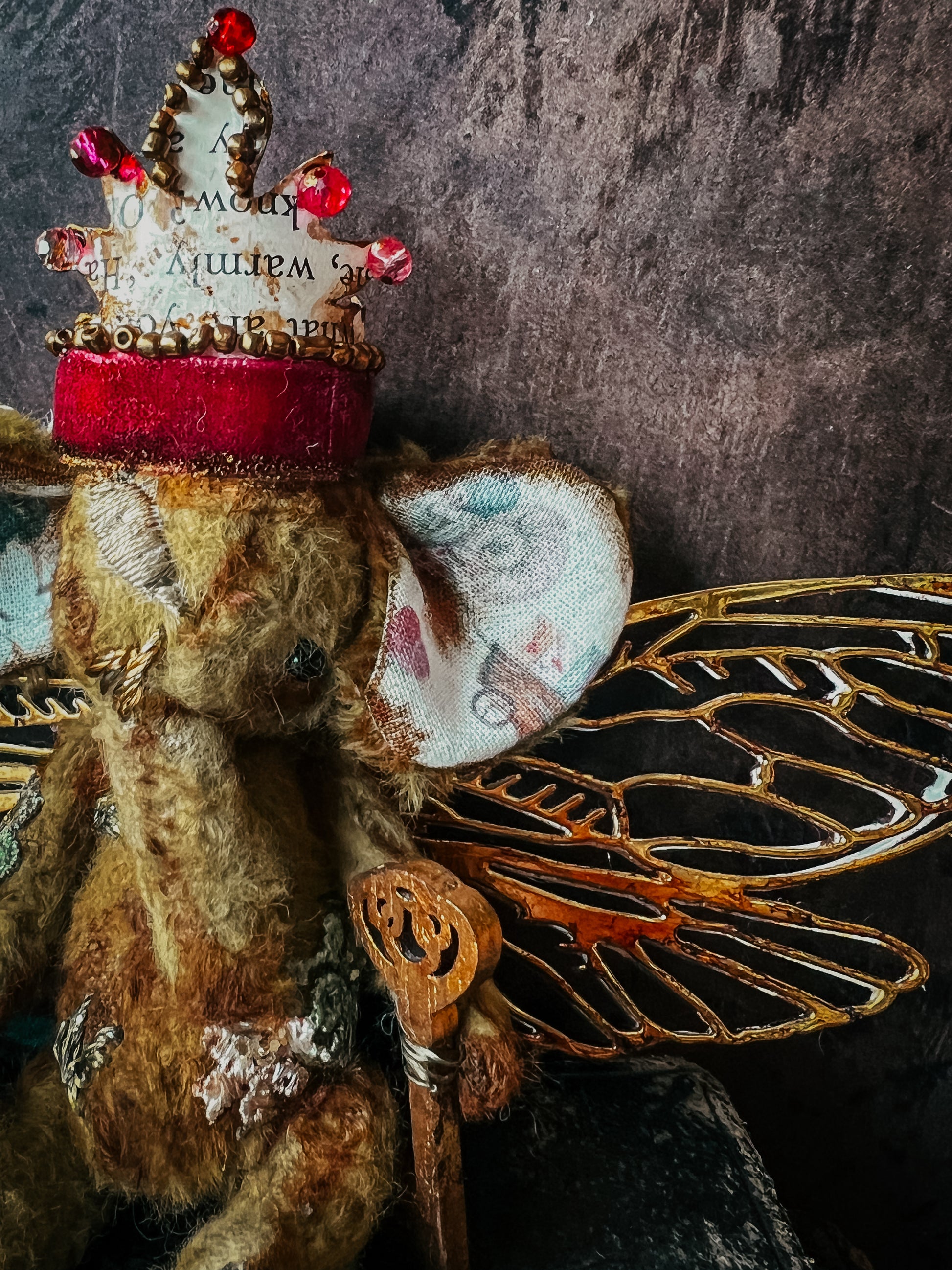 Tatiana is a one of a kind mini artist teddy elephant fairy. She is made with soft hand dyed viscose fur. Her additional details are made with the following materials: old book paper, glass beads, metallic card (wings), embroidered trim, velvet ribbon, and she holds a painted wooden key.