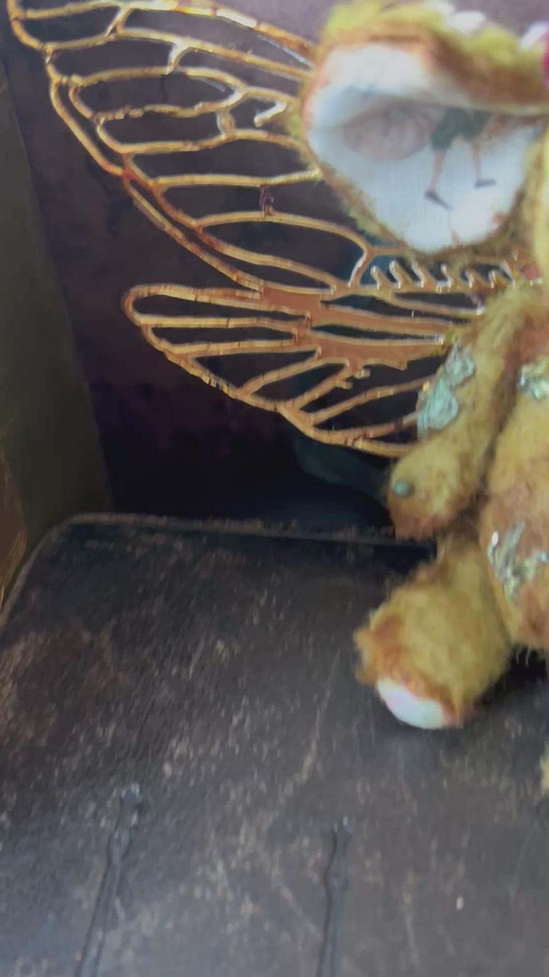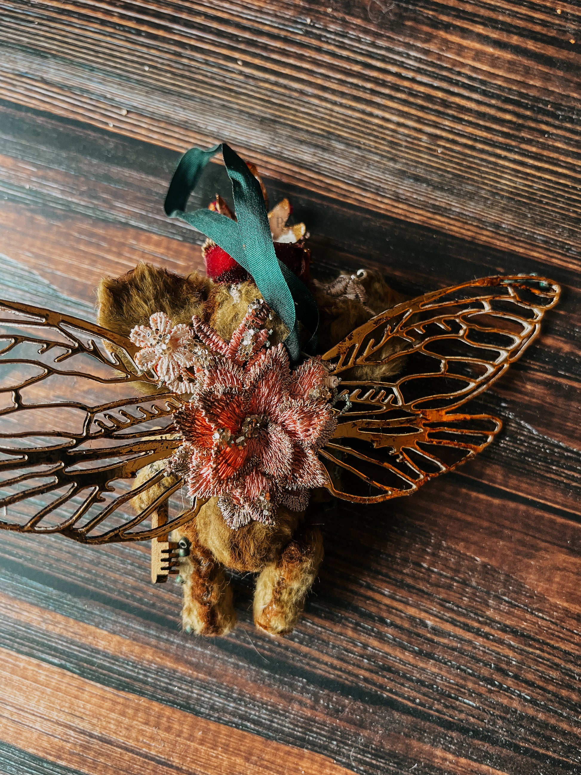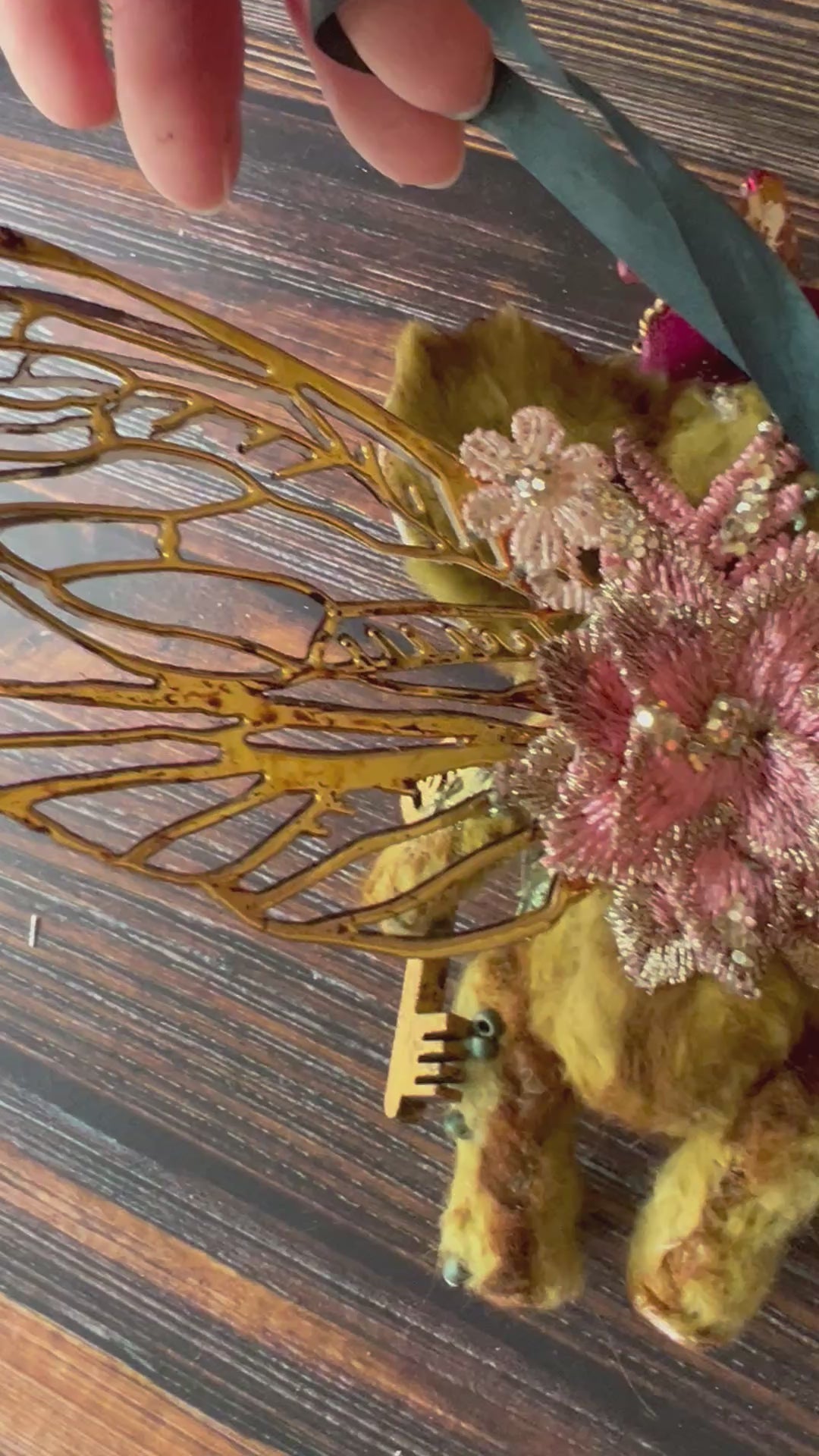 Tatiana is a one of a kind mini artist teddy elephant fairy. She is made with soft hand dyed viscose fur. Her additional details are made with the following materials: old book paper, glass beads, metallic card (wings), embroidered trim, velvet ribbon, and she holds a painted wooden key.