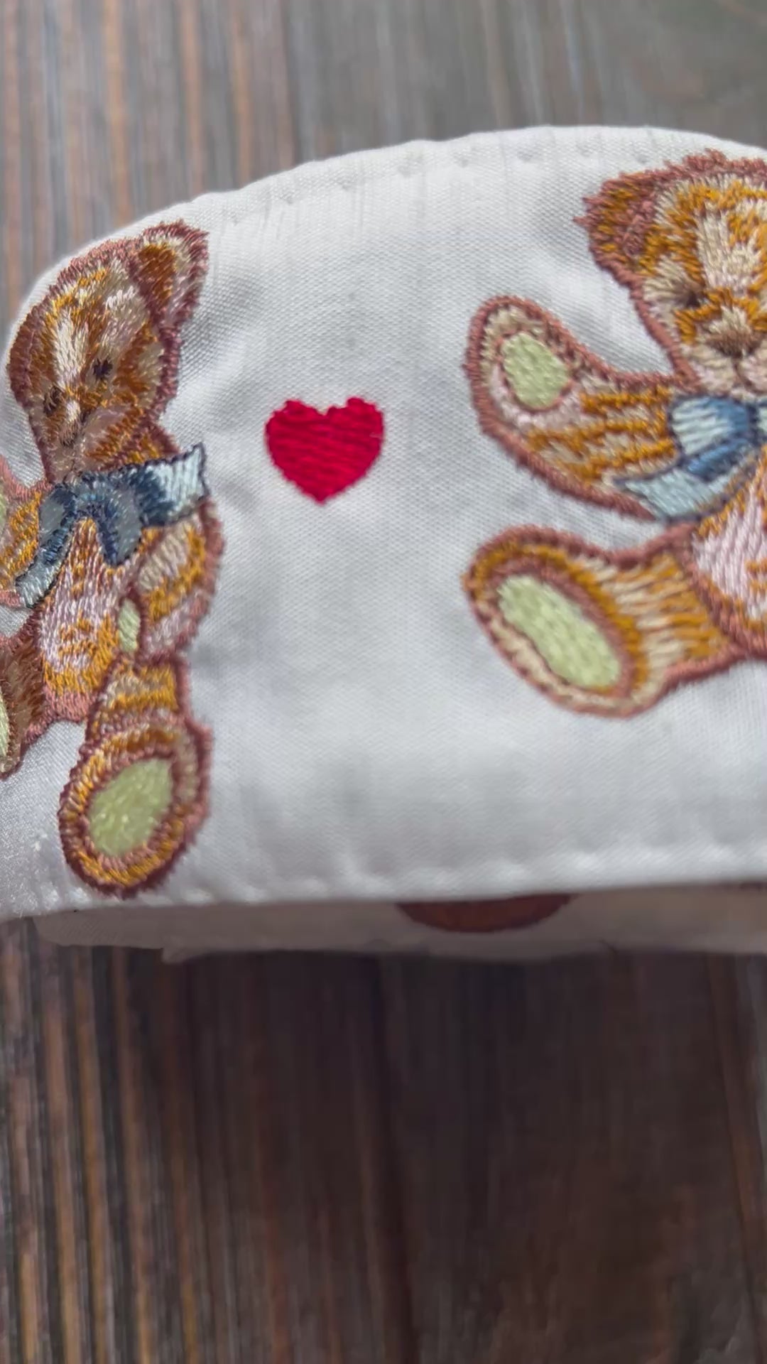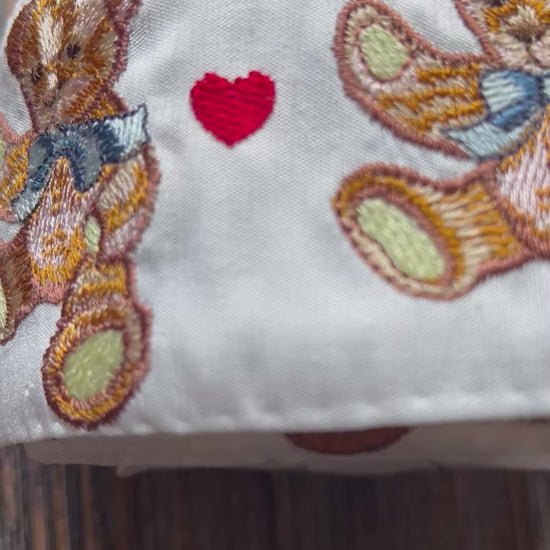 Teddy bear love embroidered trim, around 2inches wide, is a cute accent piece featuring teddy bear and red love heart embroidery on a soft white fabric base. An adorable trim, of course I had to get it as a teddy bear artist! Perfect for enhancing bullet journal covers, clothing accents, bag trims, or unique handmade artist bears, this trim adds a handcrafted touch to any creative project. Sold by the metre for versatile use. If you purchase multiple metres, it will be cut only once.