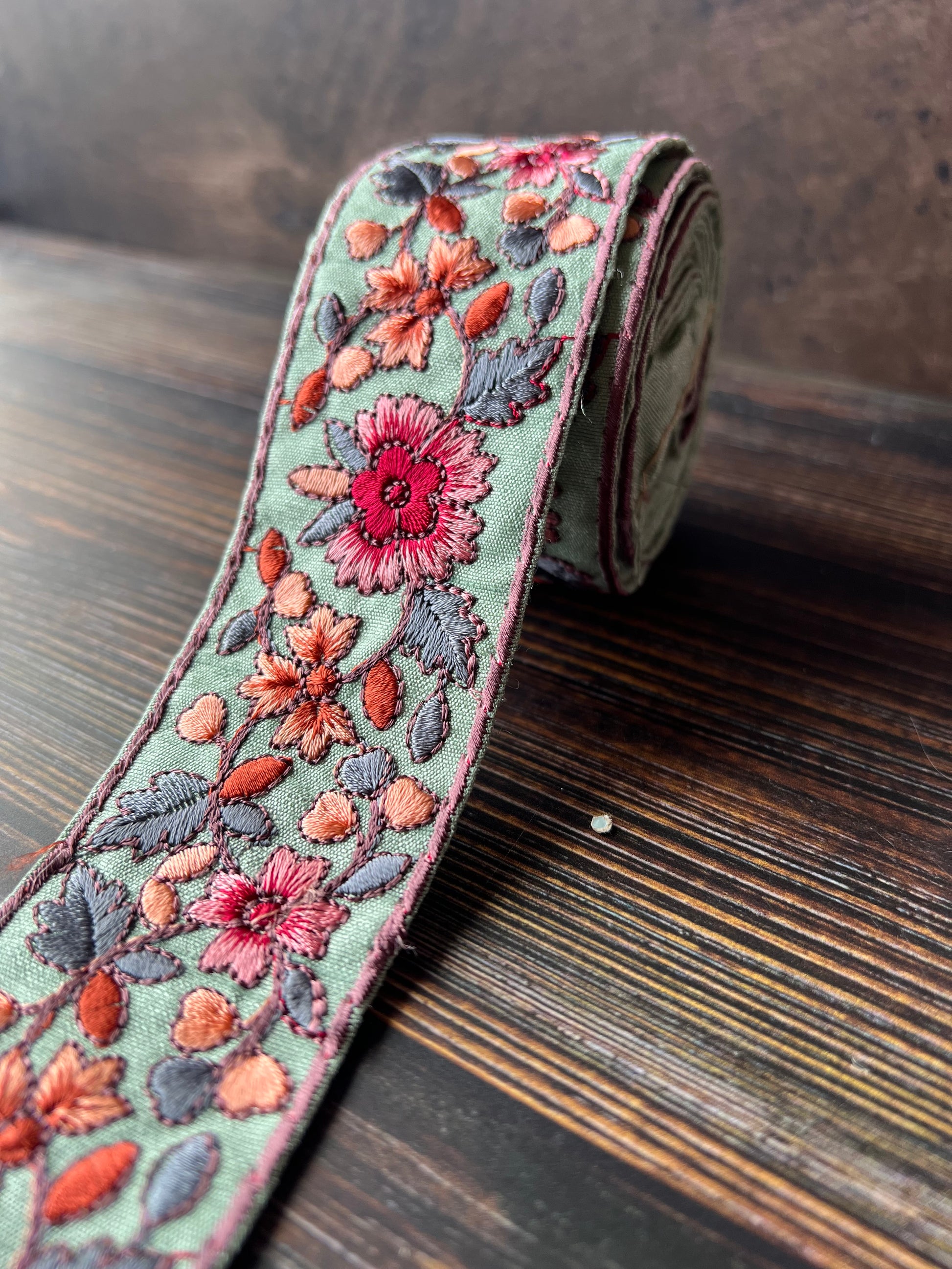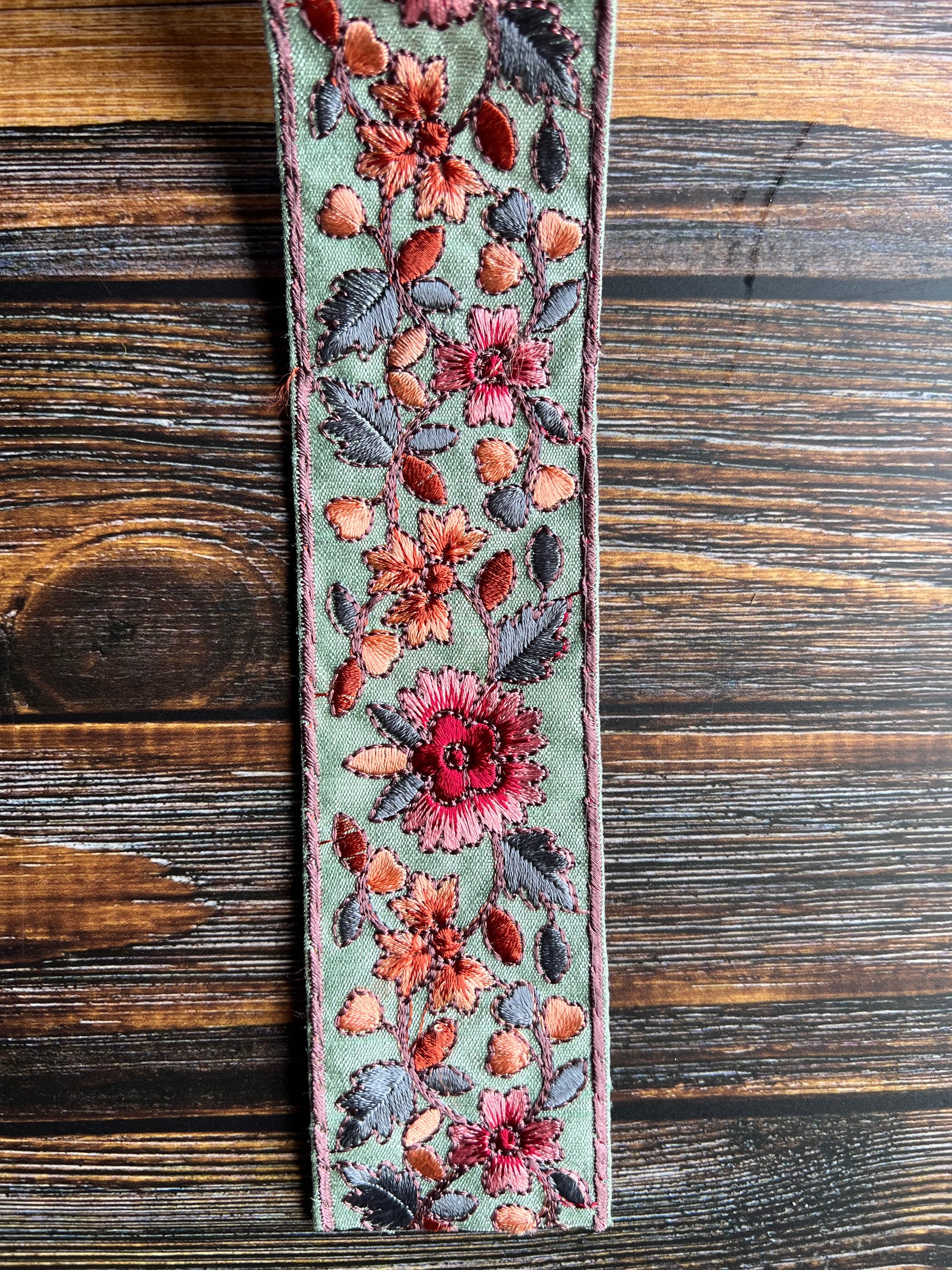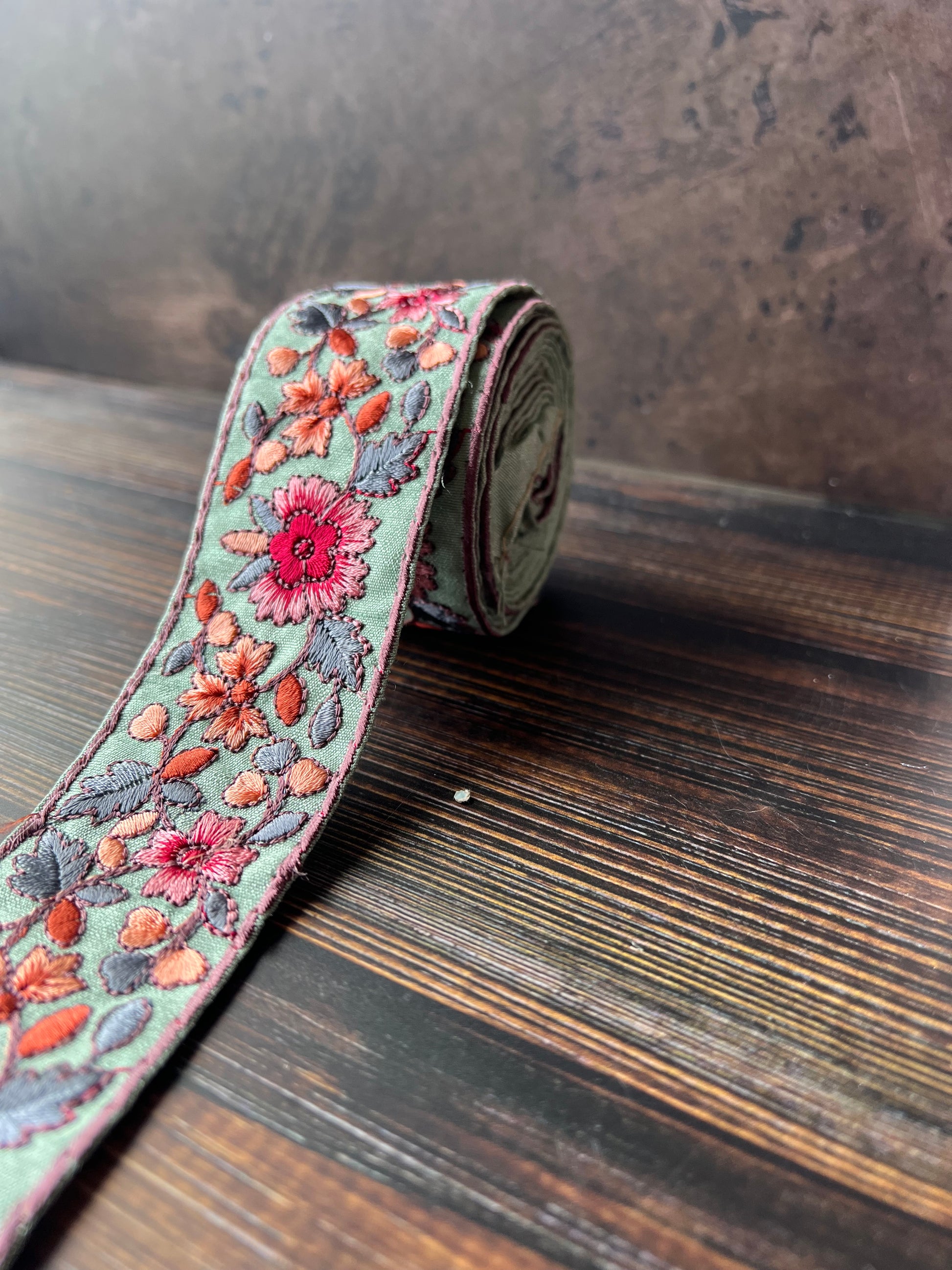 Turquoise Beauty embroidered trim, around 1.5inches wide, is a beautiful accent piece featuring multicoloured floral embroidery on a soft Turquoise fabric base. Beautiful colours. Perfect for enhancing bullet journal covers, clothing accents, bag trims, or unique handmade artist bears, this trim adds a handcrafted touch to any creative project. Sold by the metre for versatile use. If you purchase multiple metres, it will be cut only once.